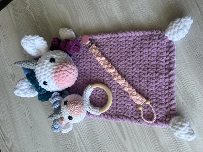 Měkký usínáček/hajánek pro miminko a dítě , chrastitko s kousatkem a klip na dludlíček
