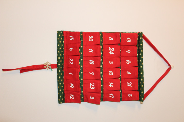 Adventní kalendáře z eko bavlny a dřeva, vhodné i pro děti, které ještě neumí čísla (aktuální dny lze označit kolíčkem s vločkou). Kalendáře lze snadno stočit a schovat na další sezónu. Rozměry jsou 34 x 41 cm, kapsičky mají 8 cm na výšku a 4-6 cm na šířku (např. 24 je nejširší), jsou hluboké. Mám posledních 5 kusů ve dvou barevných provedeních.