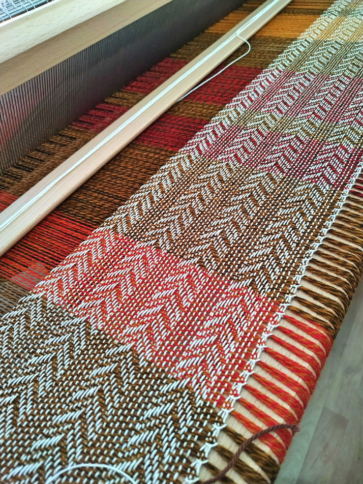 Osnova vlněná, útek bavlna. Tělo tkaniny je plátno, oba konce zdobí vzor.