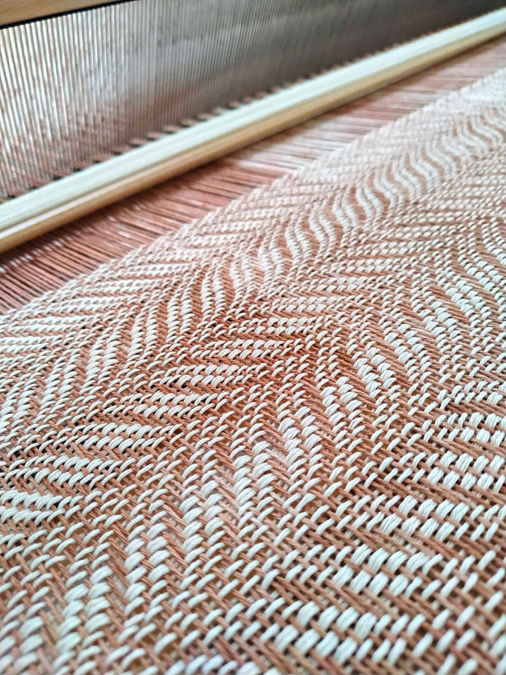 Osnova i útek je bavlna, v osnově ručně barvená, v útku přírodni.