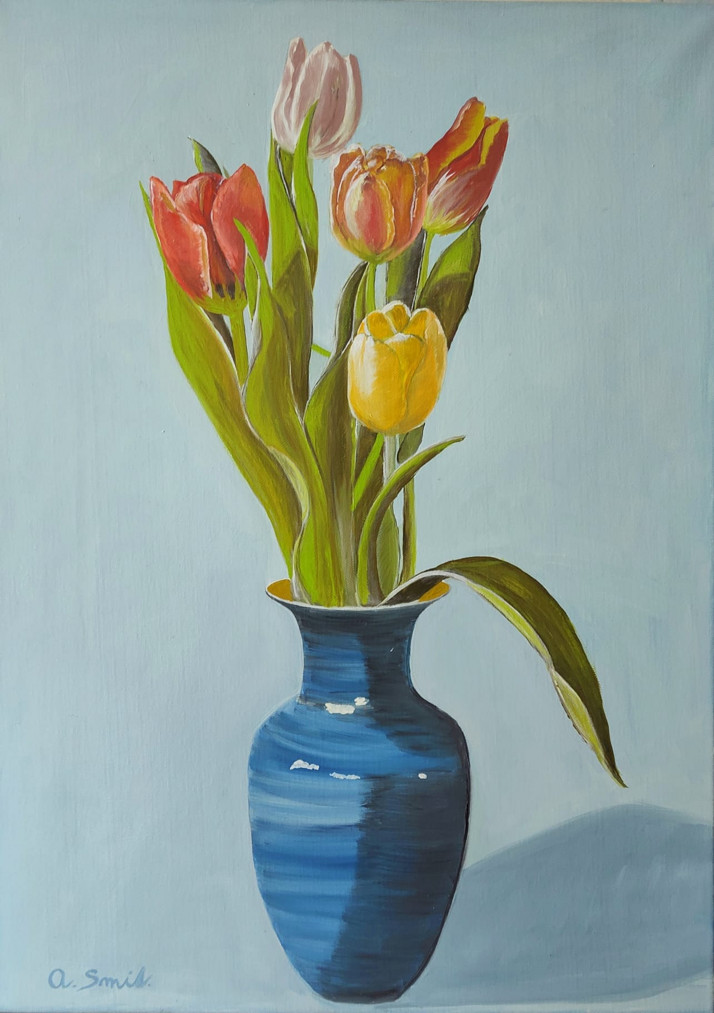 Tulipány, olej na plátně 70x50, Malované na přání (darováno). Možné namalovat podobnou, či jinou květinu v oleji (jednobarevné pozadí, v předu květina ve váze), větší formát: 7000kč. (olejovky..cca.měsíc práce, výhoda nádherného nádechu barev, jemnosti, nevýhoda dlouhého schnutí)