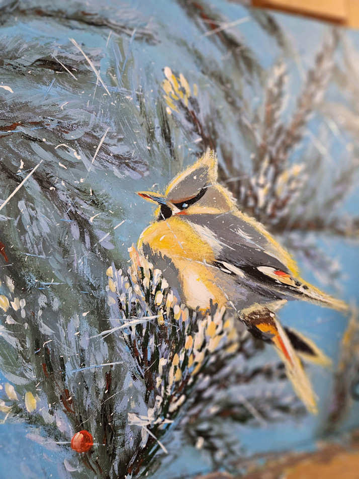 Čerstvo namaľovaný obraz so zimnou atmosférou.