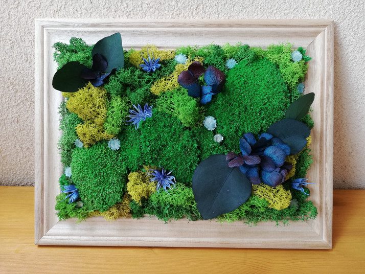 Obrázek ze stabilizovaného mechu ,sušených a stabilizovaných rostlin v dřevěném rámečku s vnitřním rozměrem velikosti A4.