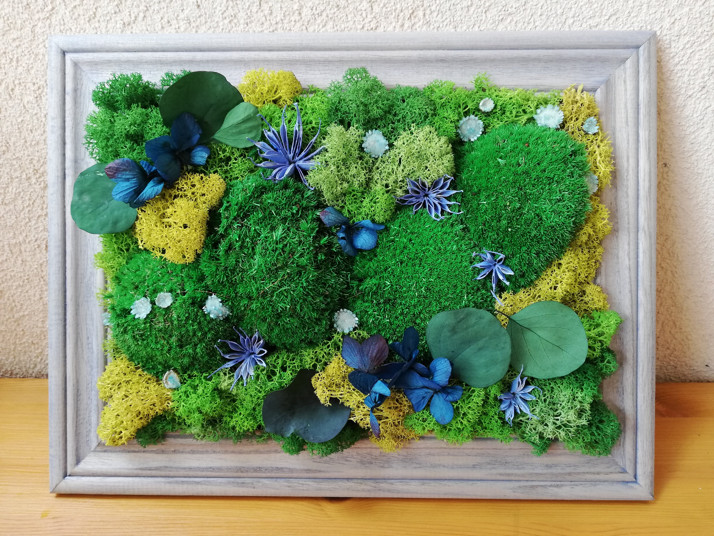 Obrázek ze stabilizovaného mechu ,sušených a stabilizovaných rostlin v dřevěném rámečku s vnitřním rozměrem velikosti A4.