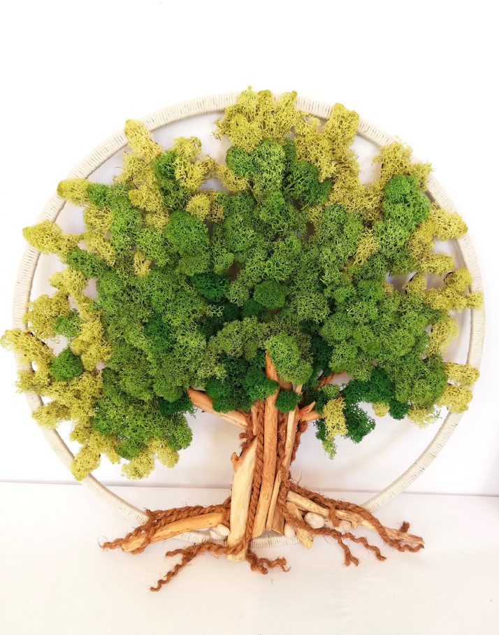 Nástěnná dekorace strom života vyrobený ze dřeva a stabilizovaného mechu. Průměr 50cm