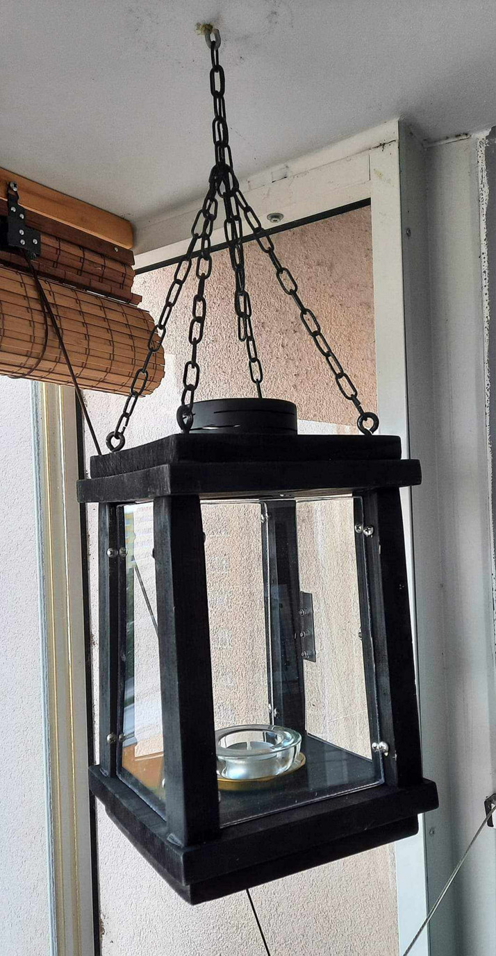 Dřevěná lucerna. Průhledný materiál - plexisklo. Ocelový řetěz.