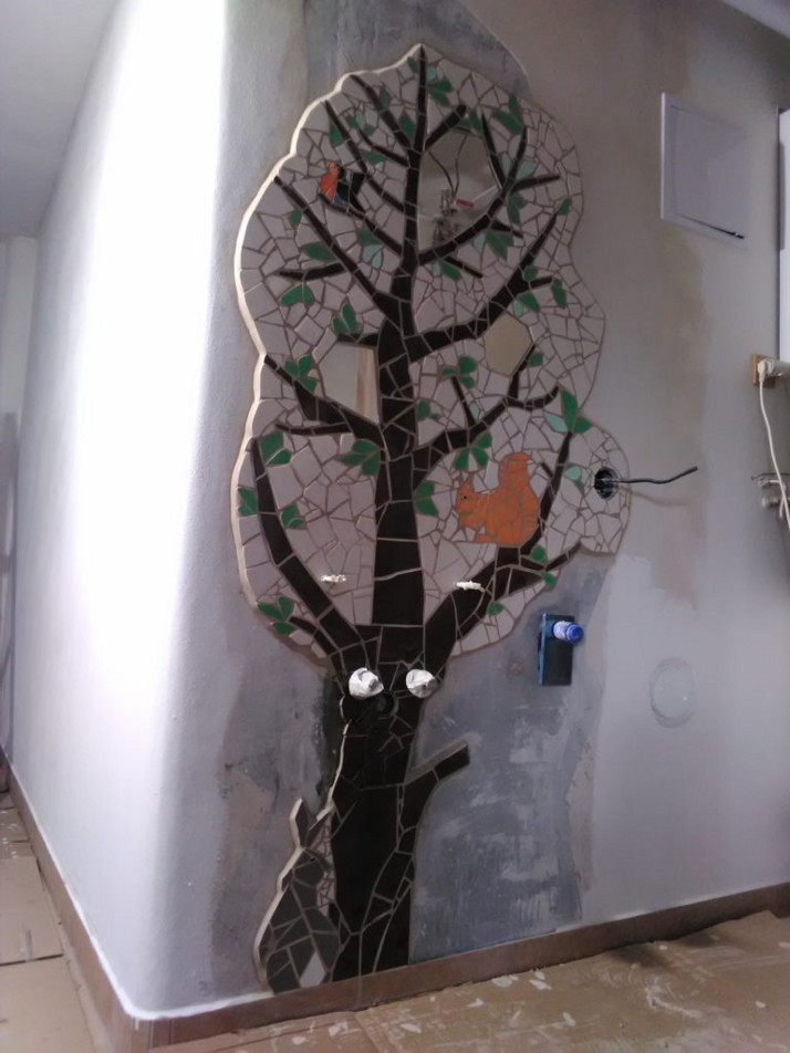 V chodbě vznikl mozaikový strom s na míru řezanými zrcátky.