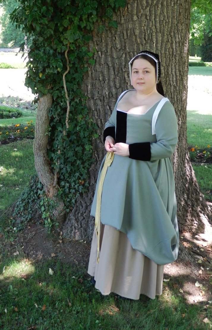 Můj renesanční kostým - spodní a vrchní vlněné šaty, sametová pokrývka hlavy (francouzská kápě)