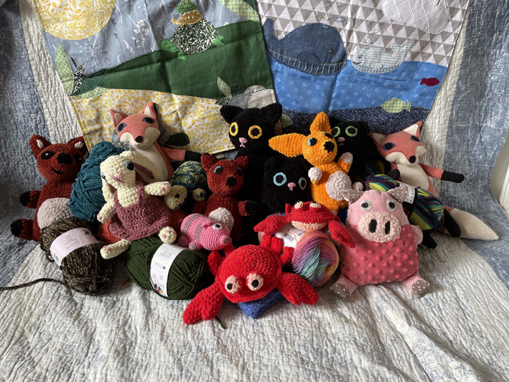 Ukázka háčkovaných a šitých plyšáků a dekorativních závěsných panelů