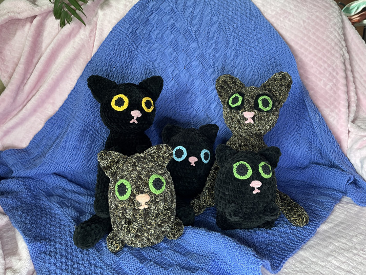 Háčkované plyšové kočky různých velikostí pojmenované Gigi a Baby Gigi podle kocourka z filmu Doručovací služba čarodějky Kiki - ale proč mají tak vykulené oči asi pochopíte, až budete mít doma kočku :-)