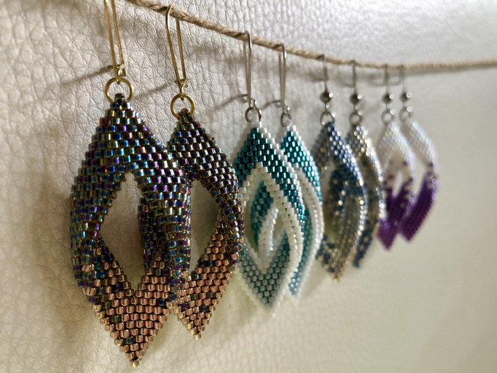Po roce tréninku jsou tu :) naušničky šité peyotovým stehem. Propracování a velmi zajímavý tvar dělají z naušnic elegantní doplněk.
