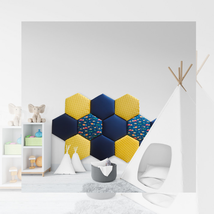 Hlavními složkami této zástěny je hořčicová minky a odolná kočárkovina se vzorem bagrů. Na zeď se lepí jednotlivě, v libovolném pořadí, pomocí suchého zipu!