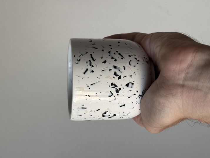 Bílá nádoba s černým terrazzo vzorem, ručně vyrobená pro sojovou svíčku. Moderní design s kontrastním detailem dodává každému interiéru styl a jedinečnost.