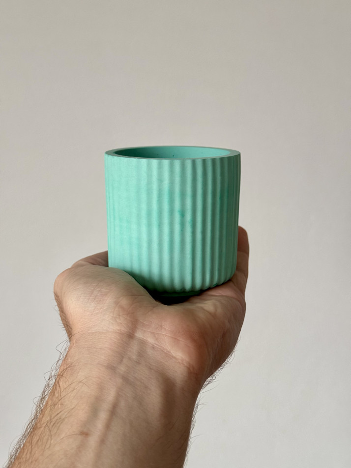 Vroubkovaná nádoba na svíčku v jemné mint barvě, ručně vyrobená s důrazem na detail. Elegantní a svěží design, který oživí váš interiér a dodá mu moderní nádech.