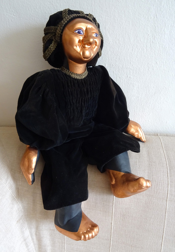 Figurka vyrobená z tvrzené sádry, dřeva, drátů a textilu. Malovaná akrylovými a patinovaná mistrovskými olejovými barvami a přelakovaná.