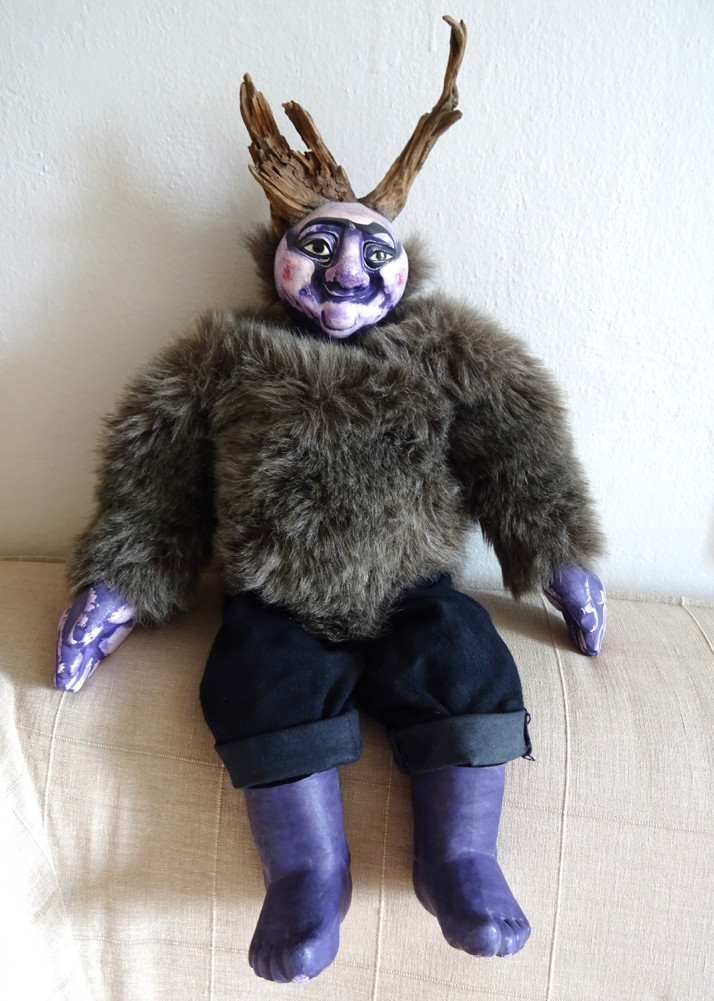 Figurka vyrobená z tvrzené sádry, dřeva, drátů a textilu. Malovaná akrylovými a patinovaná mistrovskými olejovými barvami a přelakovaná.