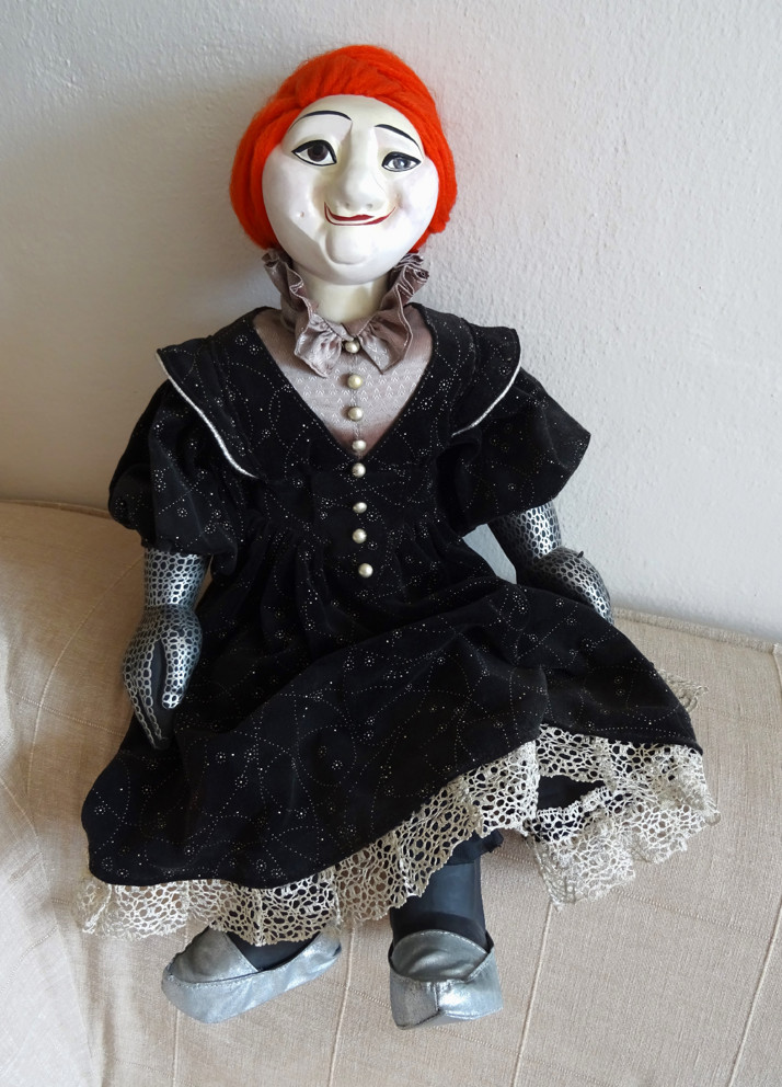 Figurka vyrobená z tvrzené sádry, dřeva, drátů a textilu. Malovaná akrylovými a patinovaná mistrovskými olejovými barvami a přelakovaná.