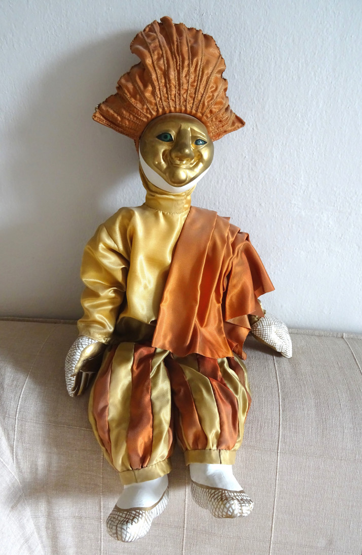 Figurka vyrobená z tvrzené sádry, dřeva, drátů a textilu. Malovaná akrylovými a patinovaná mistrovskými olejovými barvami a přelakovaná.