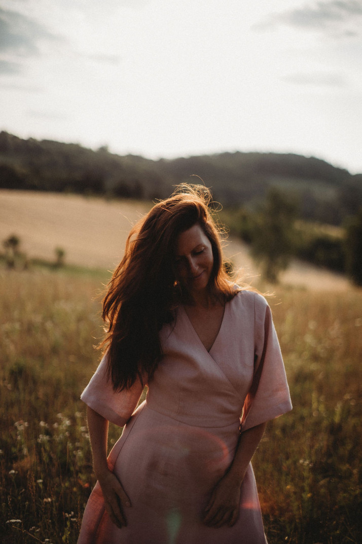 Lněné zavinovací šaty s kapsami a rozšířenými rukávy krásně podtrhnou vaši ženskost.