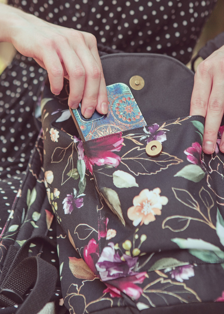 Dámský větší batoh s motivem zlatých a červených květů (detail).