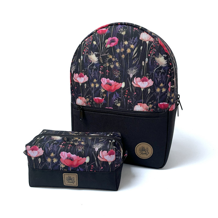 Dámský menší batůžek s motivem fialových vlčích máků. Kosmetická taštička Basic ve stejném motivu do setu.