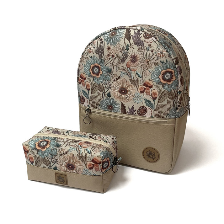 Dámský menší batůžek v béžových barvách s motivem vyšívaných květů. Kosmetická taštička Basic ve stejném motivu do setu.