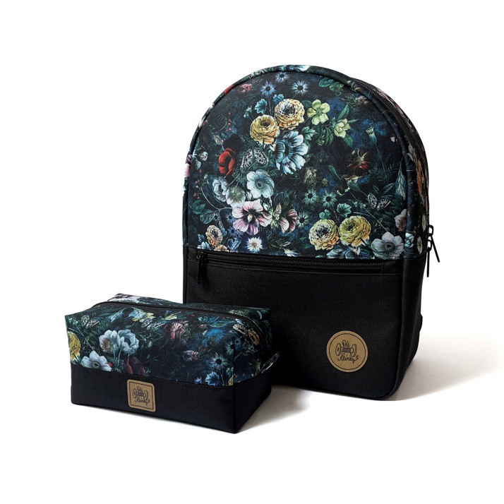 Dámský menší batůžek s tmavým motivem lučních květů. Kosmetická taštička Basic ve stejném motivu do setu.