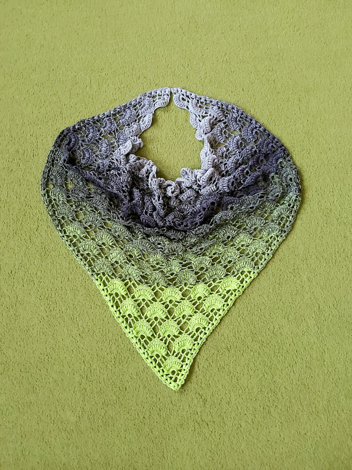 Šátek uháčkovaný z duhové příze, kde barvy přirozeně přecházejí do dalších odtínů.