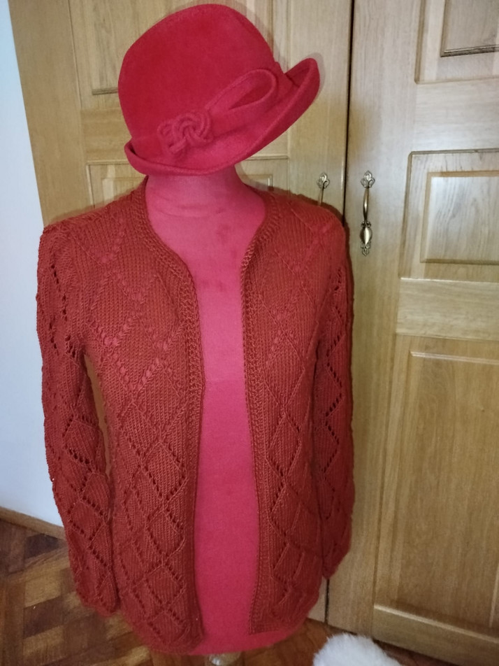 ručně pletený kardigan bez zapínání, slabší, na jaro a léto, barva zrzavo- hnědá, délka 66 cm, obvod 86 cm, rukáv 61 cm, vel. asi 38 cena 550,- Kč