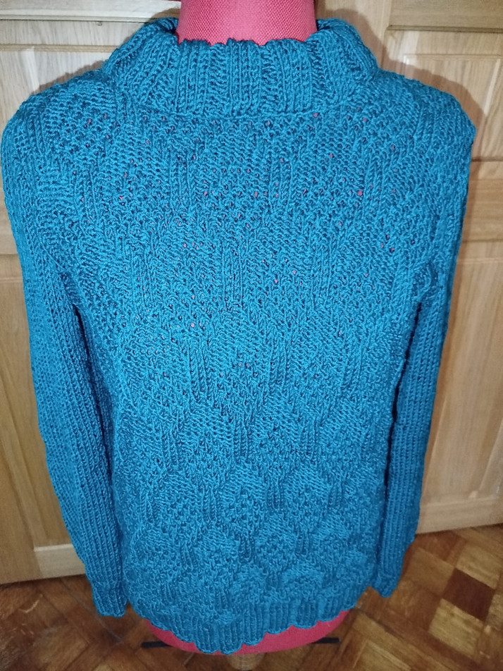 ručně pletený svetr v tyrkysové barvě, hodí se na hory i do města, teplejší, délka 65 cm, obvod 96 cm, délka rukávu 62 cm