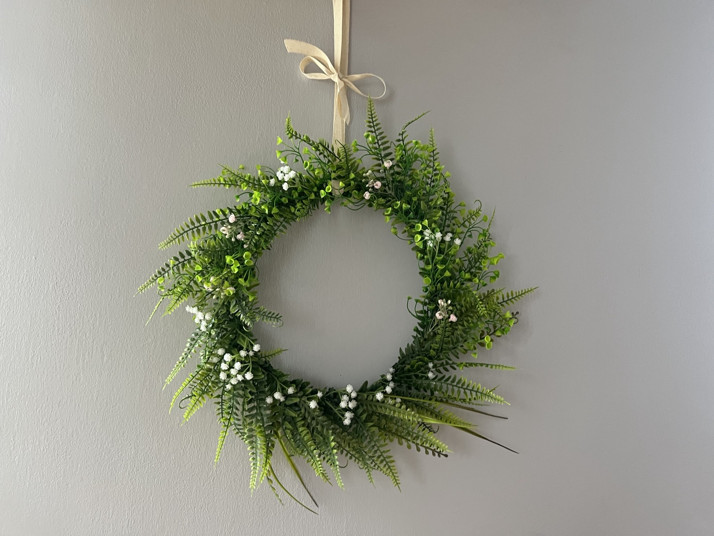 Věnec z umělého materiálu. Skládá se z kapradiny, zvonků a nevěstina závoje. Průměr věnce je 25 cm. Lze zavěsit na dveře, stěnu nebo položit na stůl.