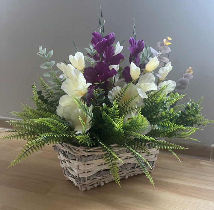 Proutěný květináč, umělé květiny, aranžovací hmota