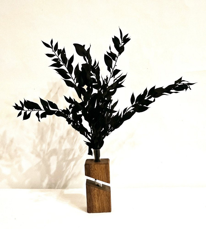 Designová váza z ořechového dřeva se skleněnou výplní je perfektní pro dokonalou kancelář ři vybavení do domácnosti. Velice elegantní váza vyplněná stabilizovaným černým ruskusem.