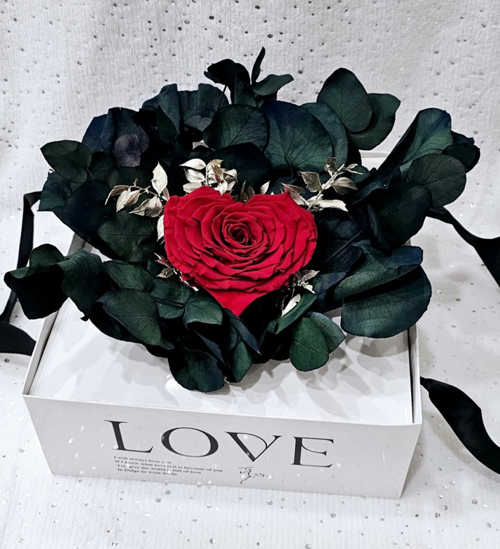 Stabilizovaná sametově červená růže tvaru srdce v dárkové krabici se stabilizovaným eukalyptusem, který má barvu lahvovězelenou s temně modrou, decentně je přizdoben stabilizovaným ruskusem zlatým.