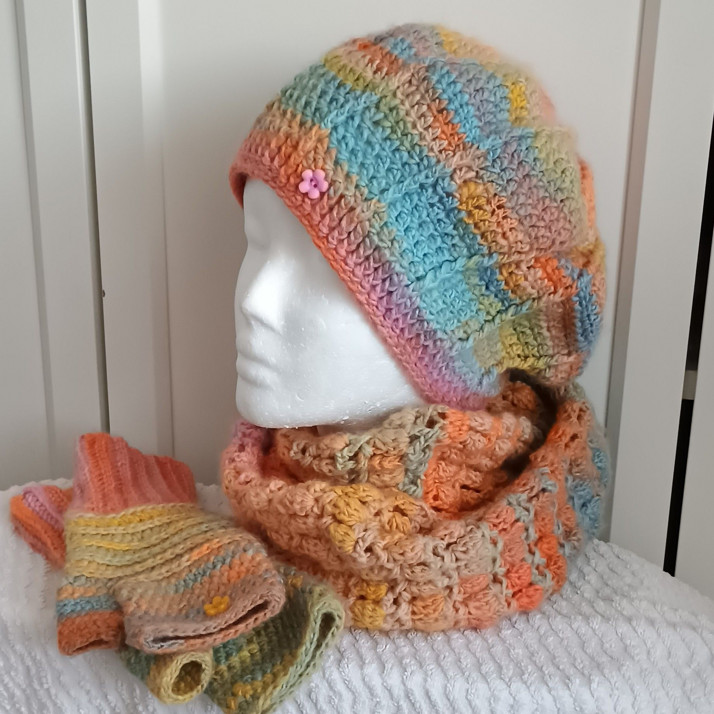 Háčkovaná souprava baretu, nákrčníku a bezprsťáků