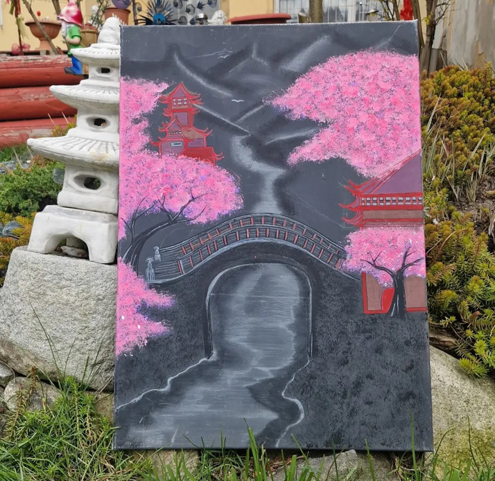 Obraz znázornuje jarni vecer, je v něm jemnost, díky rozkvetlým tradičním stromum, očištěno posvatným dřívkem palosanto, pro co možná nejlepší efekt
