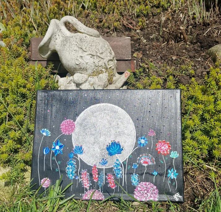 Kresleno akrylem, zdobeno kaminky, očištěno