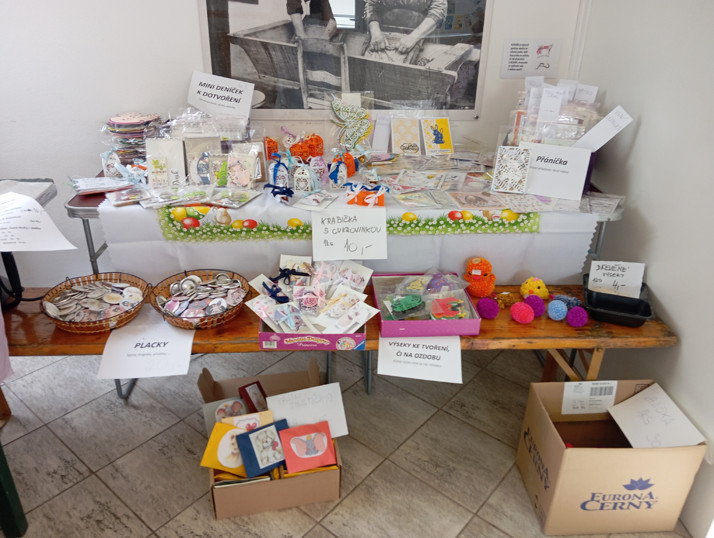 Prodej drobností. Přáníčka, papírové výrobky, svícny a výseky z moosgumi, dárkové krabičky s cukrovinkou, placky- magnety, spony, přívěsky.