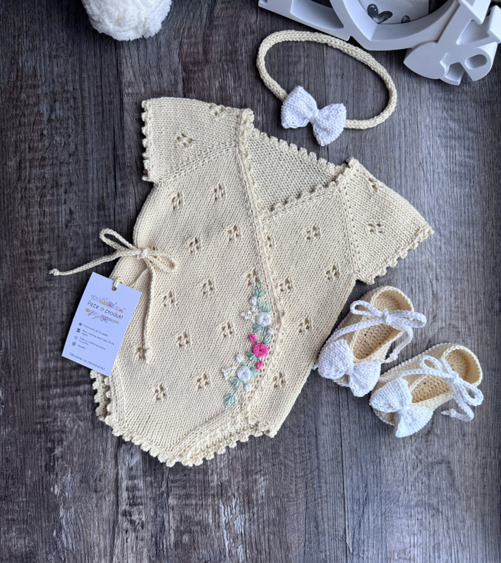 Body je pletené jehlicemi, ozdobené výšivkou. Součástí jsou i botičky a čelenka na hlavičku. Pro více informací a objednávky napište do zpráv.”