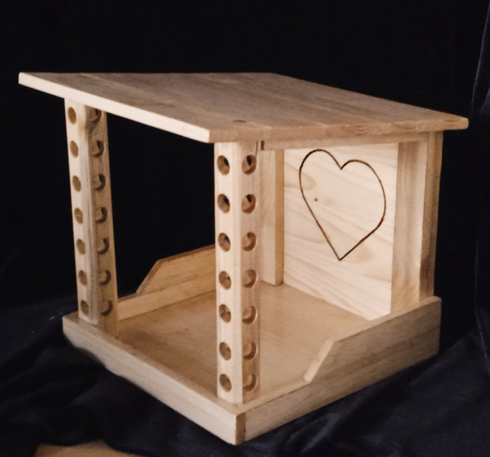 Krmítko ze smrkového dřeva, vyrobené na přání, v menších rozměrech na balkón. Nalakované lodním lakem pro venkovní použití s ručně vypalovaným srdcem