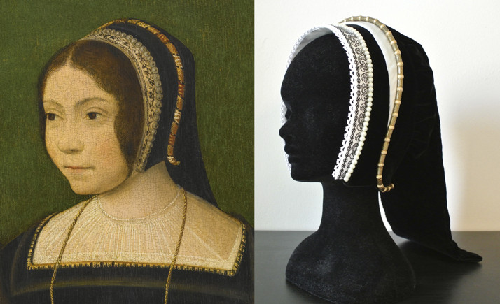 Vzhledově historicky věrná renesanční pokrývka hlavy ke kostýmu ve stylu Nizozemí / Francie, cca 1530.