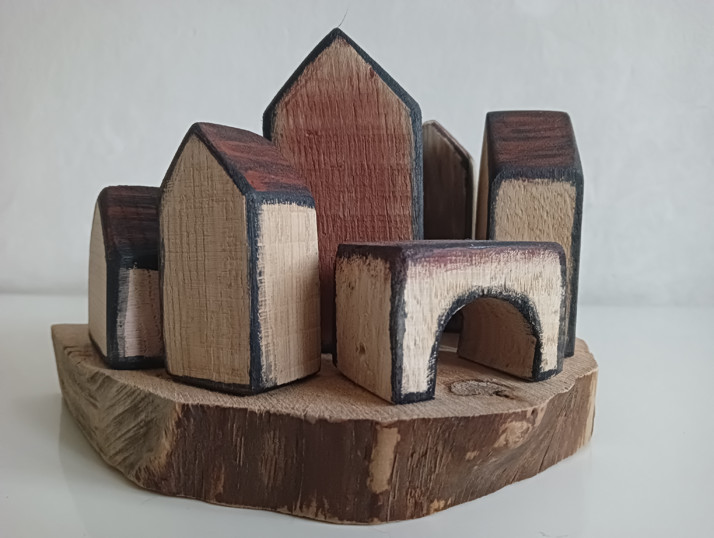 Miniatura dřevěného městečka v hnědých barvách vhodné jako interiérová dekorace, možno dozdobit. Možno koupit i s dřevěnou podložkou z masivu.