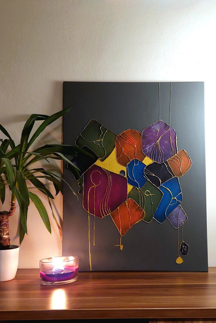 Tento obraz tvoří barevné organické tvary, které se navzájem proplétají zlatou linkou jako myšlenky nebo vzpomínky. Každý tvar má svou strukturu, jinou barevnost, jinou emoci – ale všechny spolu ladí. Celé to připomíná mozaiku lidského nitra – vzpomínek, emocí, zážitků, které se propojují a vytvářejí celek.