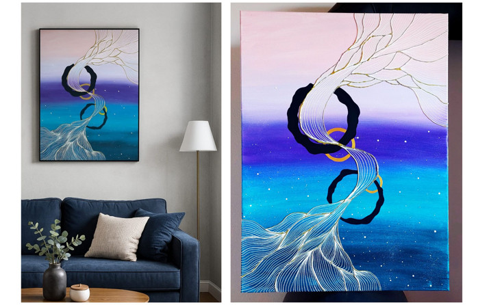 V obrazu „Plynutí“ se setkává klid s pohybem. Jemné linie se vlní jako proud energie, který propojuje světlo a stín, den a noc, začátek a konec. Přechody barev od něžné růžové přes fialovou až po hlubokou modř vytvářejí dojem nekonečného prostoru. Zlaté akcenty symbolizují okamžiky, které září uprostřed proudu života – malé, ale nezapomenutelné. Tento obraz je pozvánkou k zastavení, nadechnutí a uvědomění si, že i v neustálé změně můžeme najít harmonii.
