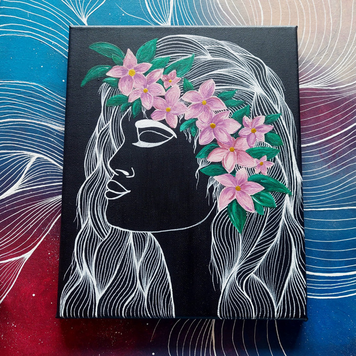 V obrazu „V hlavě“ se potkává jednoduchost linie s bohatostí myšlenek a snů. Silueta ženy, tvořená jen jemným náznakem, nechává prostor pro vlastní interpretaci – je to ona, nebo odraz nás samotných? Květiny ve vlasech symbolizují nápady, vzpomínky a touhy, které se v hlavě rodí a kvetou, pokud jim dáme prostor. Černé pozadí umocňuje kontrast mezi tichem uvnitř a barevným životem myšlenek. Tento obraz je připomínkou, že naše mysl je zahradou – a záleží na nás, co v ní necháme růst.