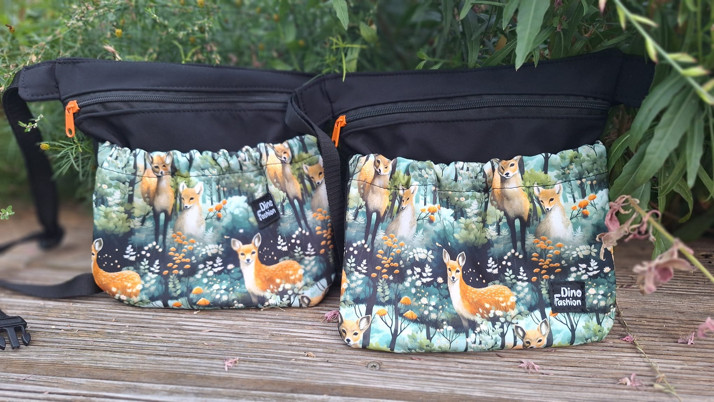 Ledvinka na pamlsky s lesním motivem. Pamlskovník lze snadno upnout kolem pasu a pamlsky máte vždy po ruce. Kapsa na gumu je otevřená, lze tedy snadno vsunout ruku pro pamlsky, nic nemusíte rozepínat.
