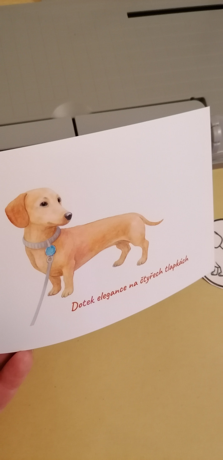 Pohlednice se jezevčíkem, ručně tvořena, autorská práce a nadpis