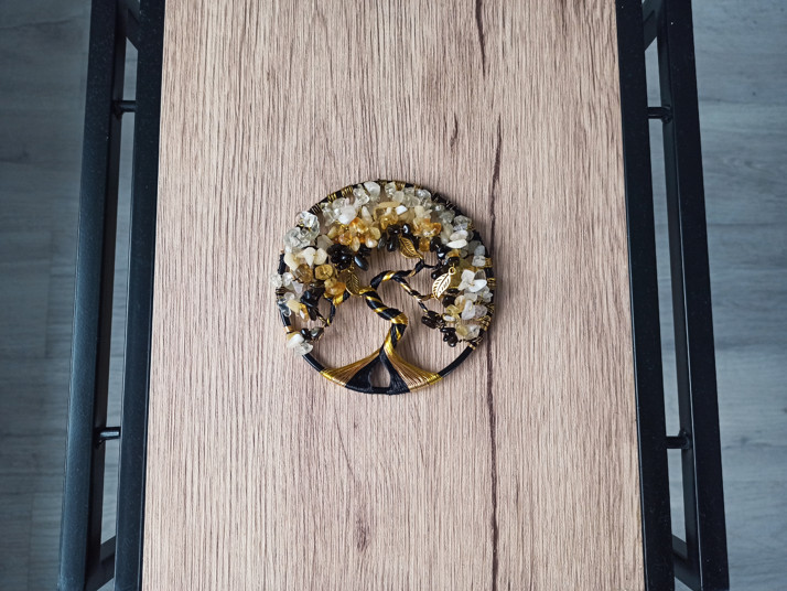 Drátovaný strom s minerály o průměru 10 cm.