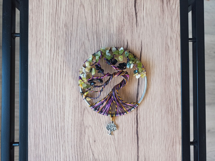 Drátovaný strom s minerály o průměru 10 cm.