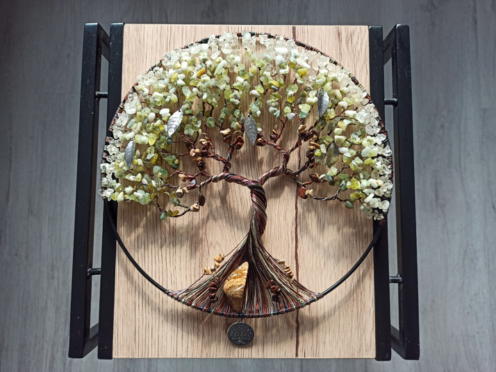 Drátovaný strom s minerály o průměru 25 cm.